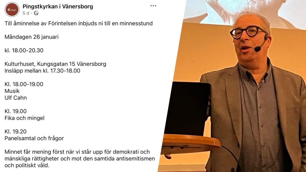 Måndagen den 26 januari bjöd Pingstkyrkan i Vänersborg till en öppen minnesstund på Folkets hus till åminnelse av Förintelsen. Huvudtalare på minnesstunden var Ulf Cahn, kommunikationschef för Med Israel för fred (MIFF), som den 15 september förra året bjöd in en IDF-soldat som deltagit i folkmordet i Gaza att föreläsa i Stockholm. – Jag såg…