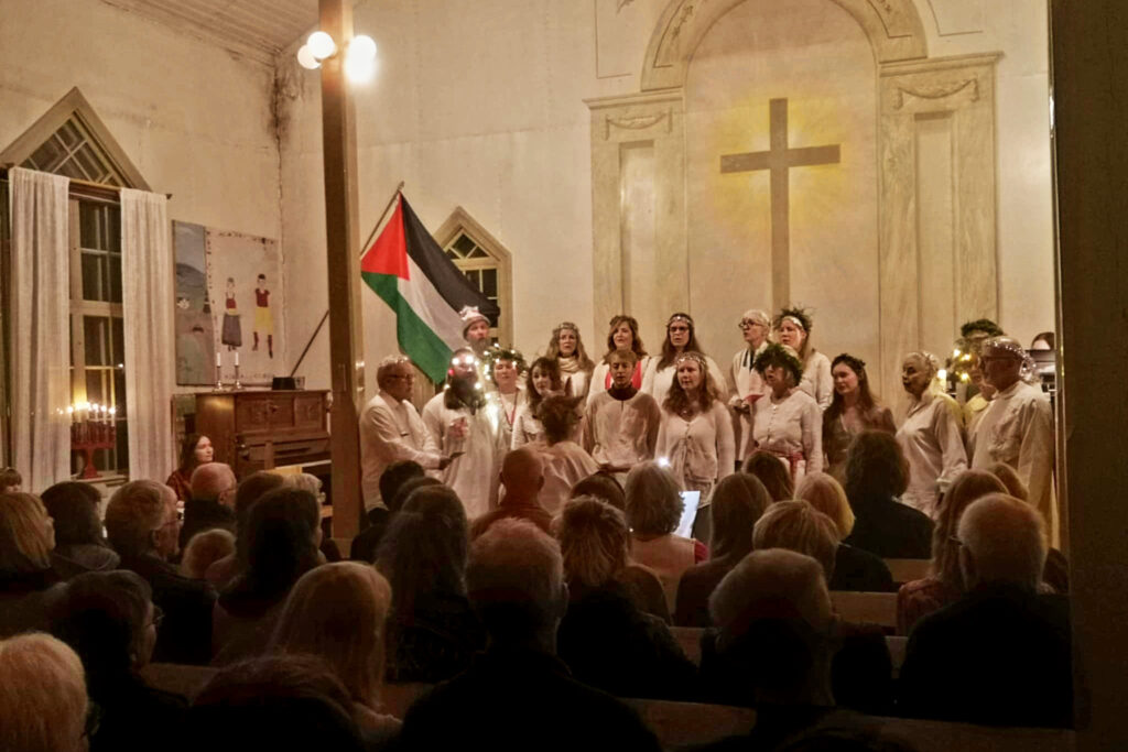 I Åhs bönhus på Delsbo forngård hölls ett lika vackert som välbesökt luciafirande arrangerat av Hälsinge freds. Sjöng gjorde Delsbo solidaritetskör och den palestinska fanan hade sin plats längst fram. Intäkterna gick i sin helhet till Palestinagruppernas insamling.
