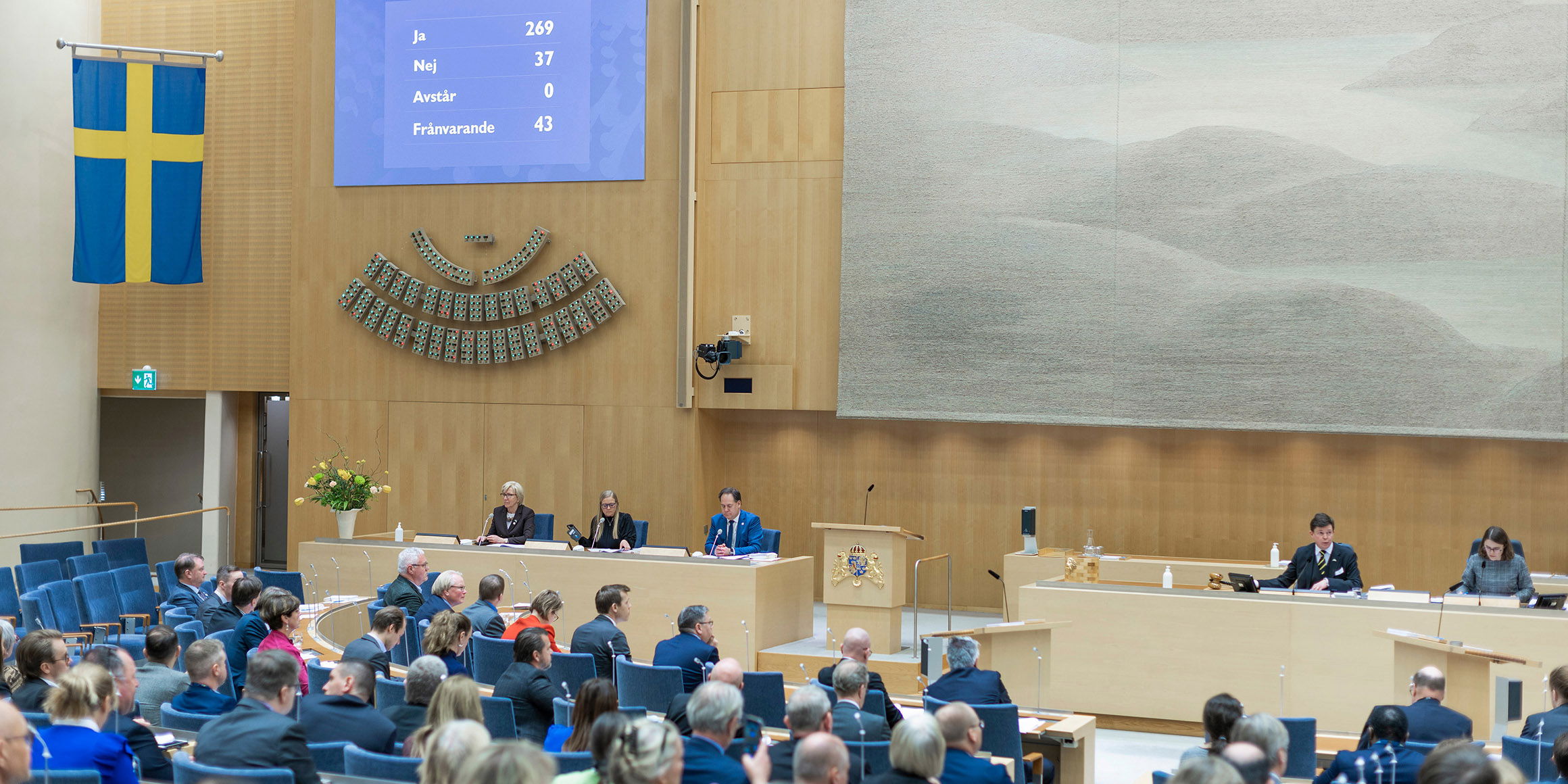 Totalt 43 ledamöter var frånvarande. Resten, 269 riksdagsledamöter från Socialdemokraterna, Centerpartiet, Liberalerna, Kristdemokraterna, Moderaterna och Sverigedemokraterna, röstade för att göra Sverige till en del av Nato.
