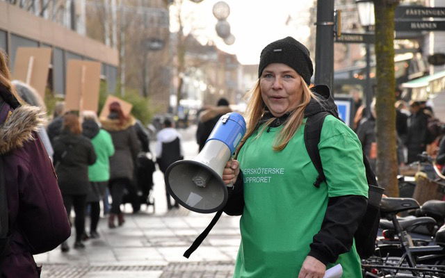 – Vi vill inte bli överkörda, utan vi vill vara med och bestämma, sa Johanna Flack på torget i Varberg och uppmanade alla undersköterskor inom kommunen att inte svara i telefonen när arbetsgivaren ringer under i sommaren för att kalla in dem som extrapersonal.