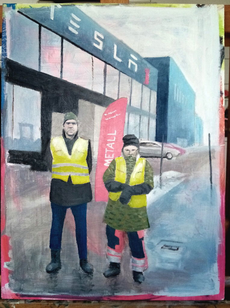 Motivet är en ögonblicksbild ur den pågående Teslastrejken för kollektivavtal, som nu är inne på sitt tredje år – och därmed är Sveriges längsta arbetsmarknadskonflikt på över ett sekel. Anders har flera gånger själv deltagit som strejkvakt utanför en Teslaverkstad, precis som många andra fackliga veteraner.