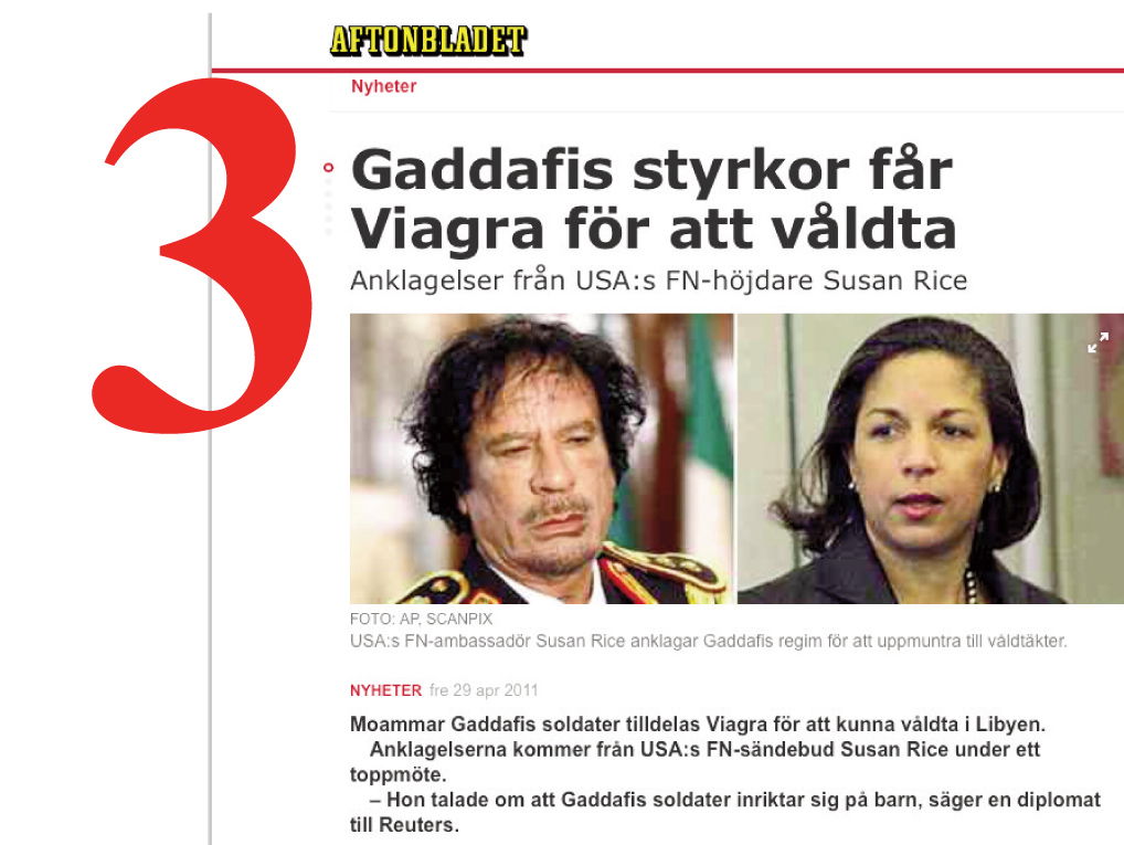 Det fanns en specifik anklagelse som bidrog till att utmåla Gaddafi som en osedvanligt hänsynslös diktator som måste störtas. Gaddafi påstods ha köpt in flera containrar med viagra till sina soldater och beordrat dem att massvåldta kvinnor i kampen mot de väststödda rebellernas uppror.