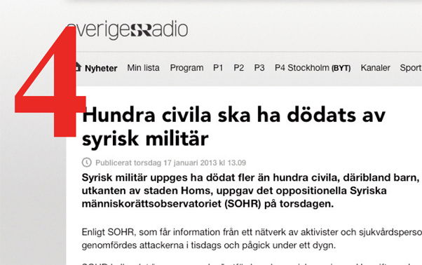 Den 17 januari 2013 publicerade många svenska medier en text från TT som sade att ”syrisk militär har dödat fler än 100 civila, däribland barn, i utkanten av staden Homs”. Som källa angavs ”oppositionella Syriska människorättsobservatoriet”.