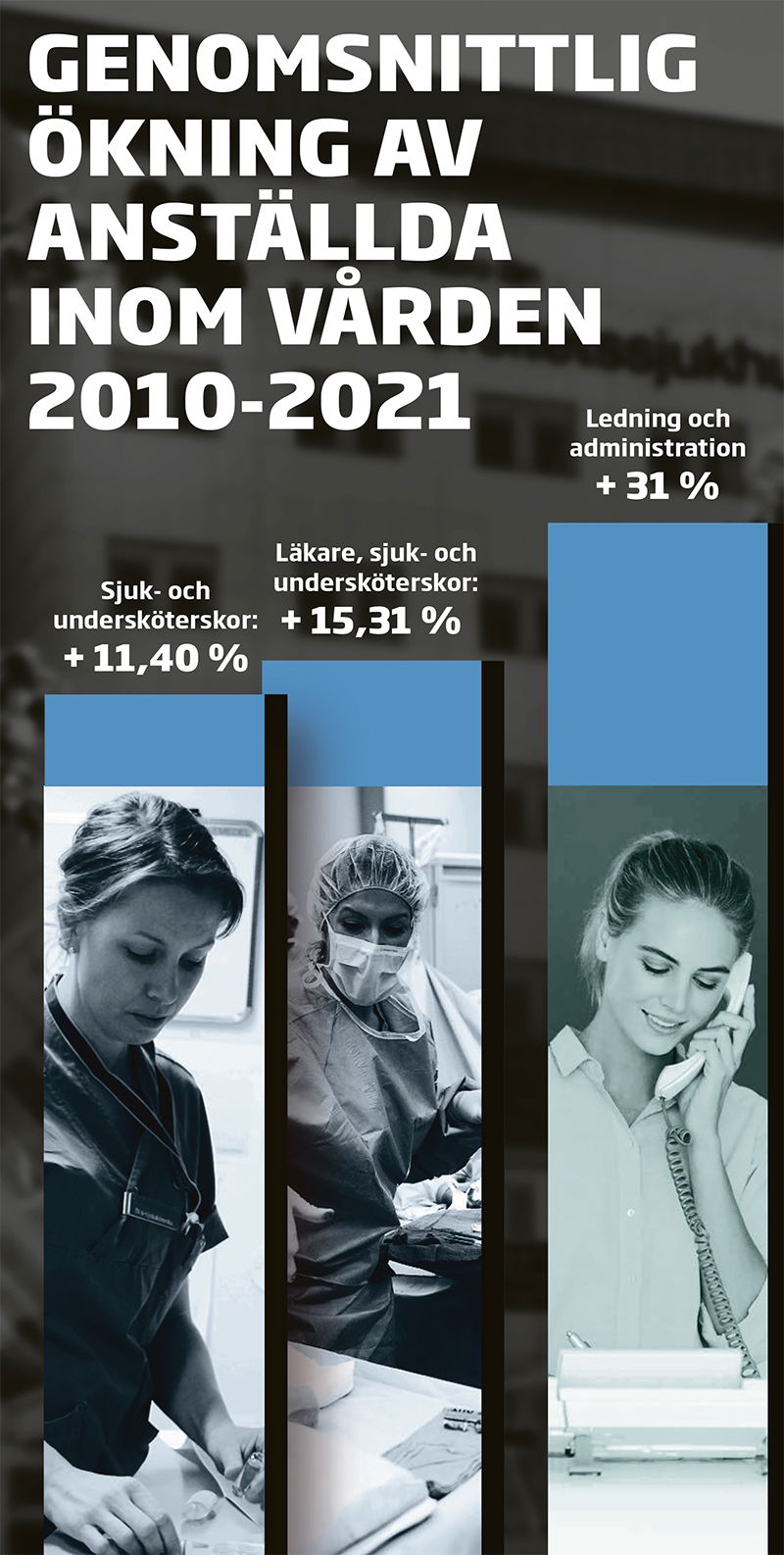Sedan år 2010 har ledning- och administrationspersonal inom sjukvården ökat med 31 procent i genomsnitt. Under samma period har antalet läkare ökat med 23 procent, undersköterskor med 16,6 procent och sjuksköterskor med 6,2 procent.
