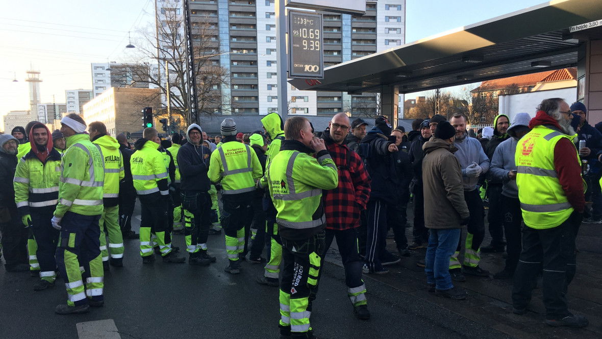 Omkring 400 ställningsbyggare samlades i måndags till en protest utanför ett bygge i Köpenhamn. Detta efter att en ställningsbyggare och en facklig sekreterare från Elforbundet misshandlats när de dagen innan skulle dokumentera den osäkra arbetsplatsen. En hamnade på sjukhus, och den andre fick bland annat brutna revben.