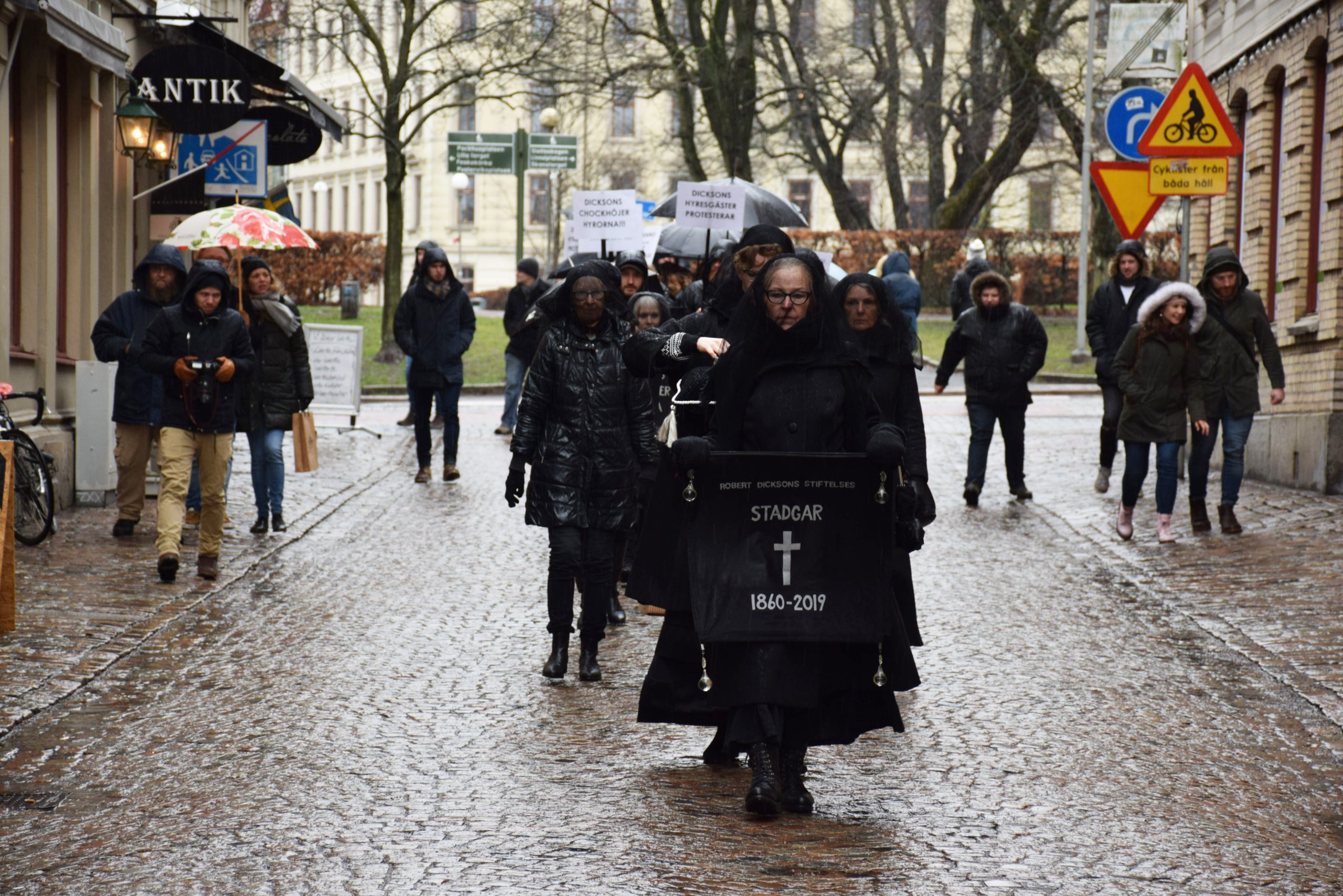 I lördags hölls ytterligare ett sorgetåg för Robert Dicksons stiftelses stadgar i Göteborg. De begravningsklädda demonstranterna tågade genom Haga i regnet för att protestera mot stundande hyreshöjningar i stiftelsens lägenheter på Carl Grimbergsgatan.