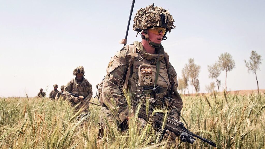 Brittiska soldater i NATO-ledda International Security Assistance Force (ISAF), där även Sverige deltog, patrullerar genom ett vetefält i Afghanistan 2014. Fotograf: Korpral Daniel Wiepen / Storbritanniens försvarsministerium