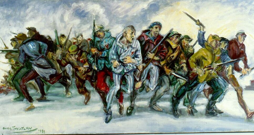 Uppror i Buchenwald 11 april 1945. Oljemålning av franske konstnären Boris Taslitzky, som själv var fånge i lägret.