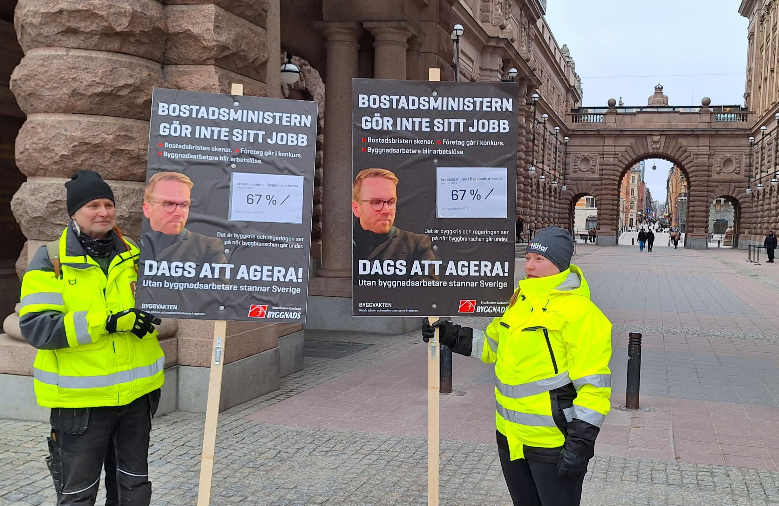 Den här tisdagen är det de som utgör byggvakten utanför riksdagen: plakaten konstaterar att bostadsminister Andreas Carlsson (KD) inte gör sitt jobb. Det byggs för lite i en tid då byggnadsarbetarna behöver jobb och svenskarna behöver bostäder.