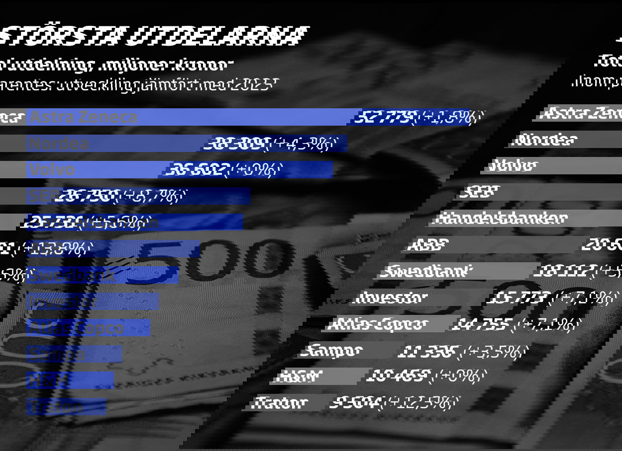Ser man till absoluta tal är det Wallenbergägda koncernen Astra Zeneca som toppar listan med en utdelning på nära 53 miljarder kronor, följt av Nordea med en utdelning på 38 miljarder. Även om Astra Zeneca och Nordea är börsnoterade i London respektive Finland, så är en stor del av deras verksamhet baserad i Sverige och deras aktier inte alls ovanliga i svenska portföljer.