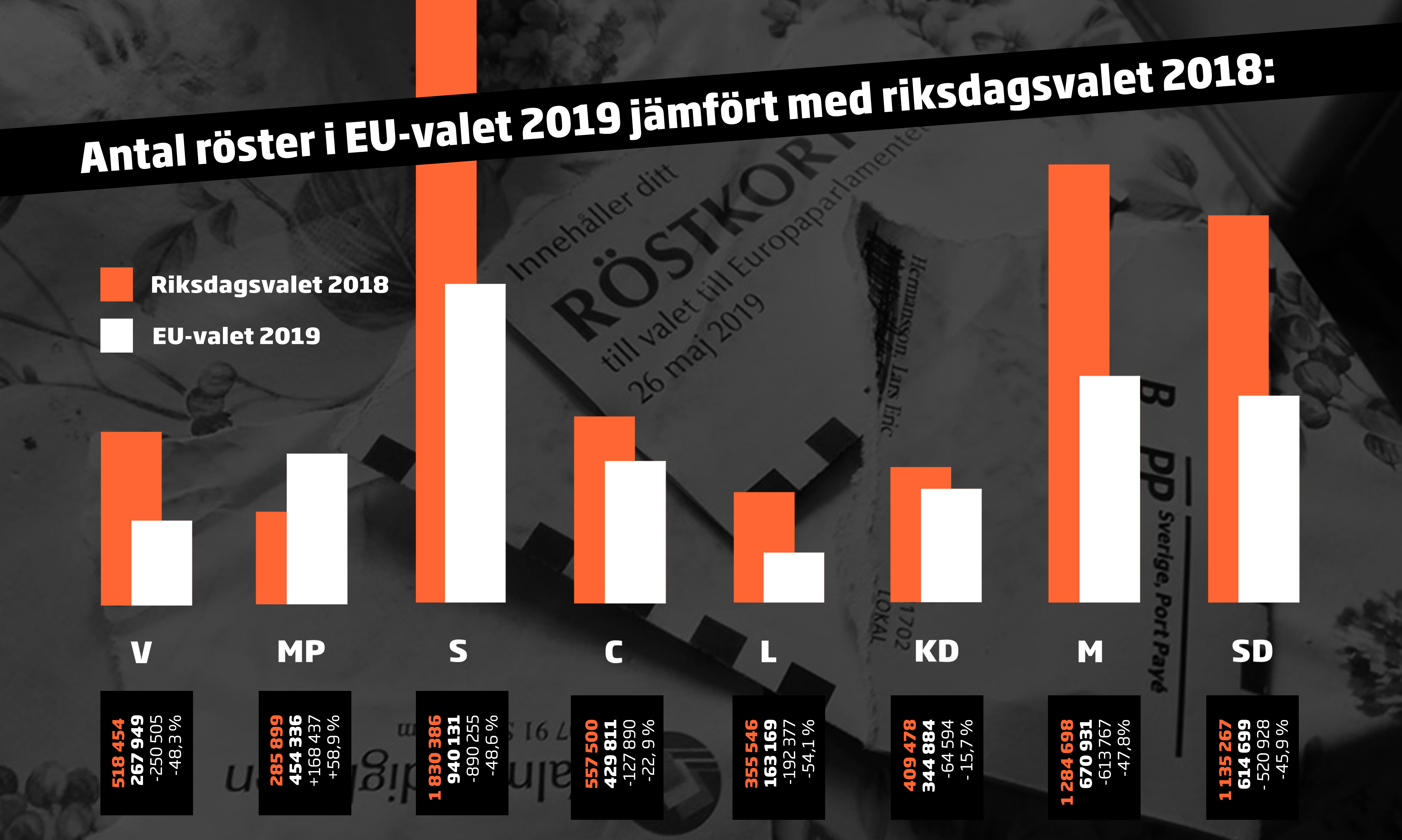 Socialdemokraterna fick 890.000 färre röster än i riksdagsvalet, Sverigedemokraterna en halv miljon färre än i valet till riksdagen.