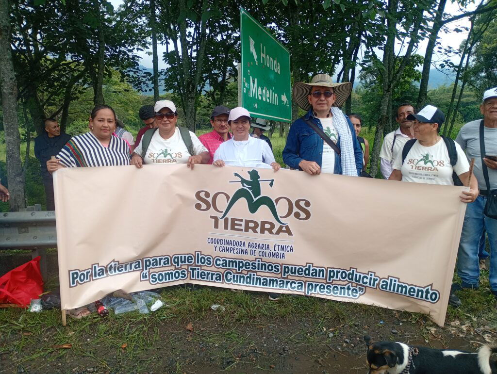 Det är bondeorganisationen Somos Tierra (Vi är jorden) som demonstrerar för att den korrumperade administrationen ska verkställa regeringens löften om bland annat jord till de jordlösa, något som ingick i fredsavtalet med Farcgerillan för nio år sedan.