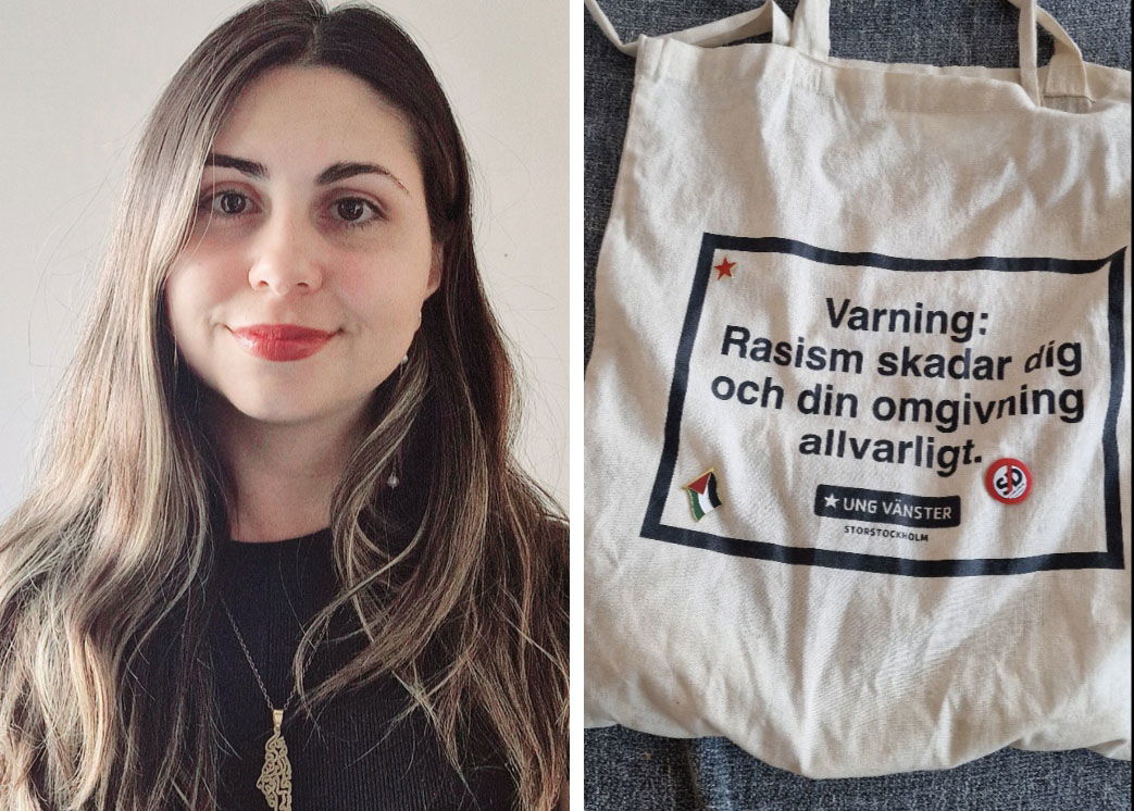 – På min väska hade jag en liten pin som föreställde den palestinska flaggan. Fyra säkerhetsvakter krävde att jag skulle ta bort märket. Jag har många märken på väskan; bredvid palestinaflaggan satt ett anti-SD-märke och en röd stjärna, och de var det inga problem med. Men palestinamärket måste bort, berättar Gabriella Orlandi.