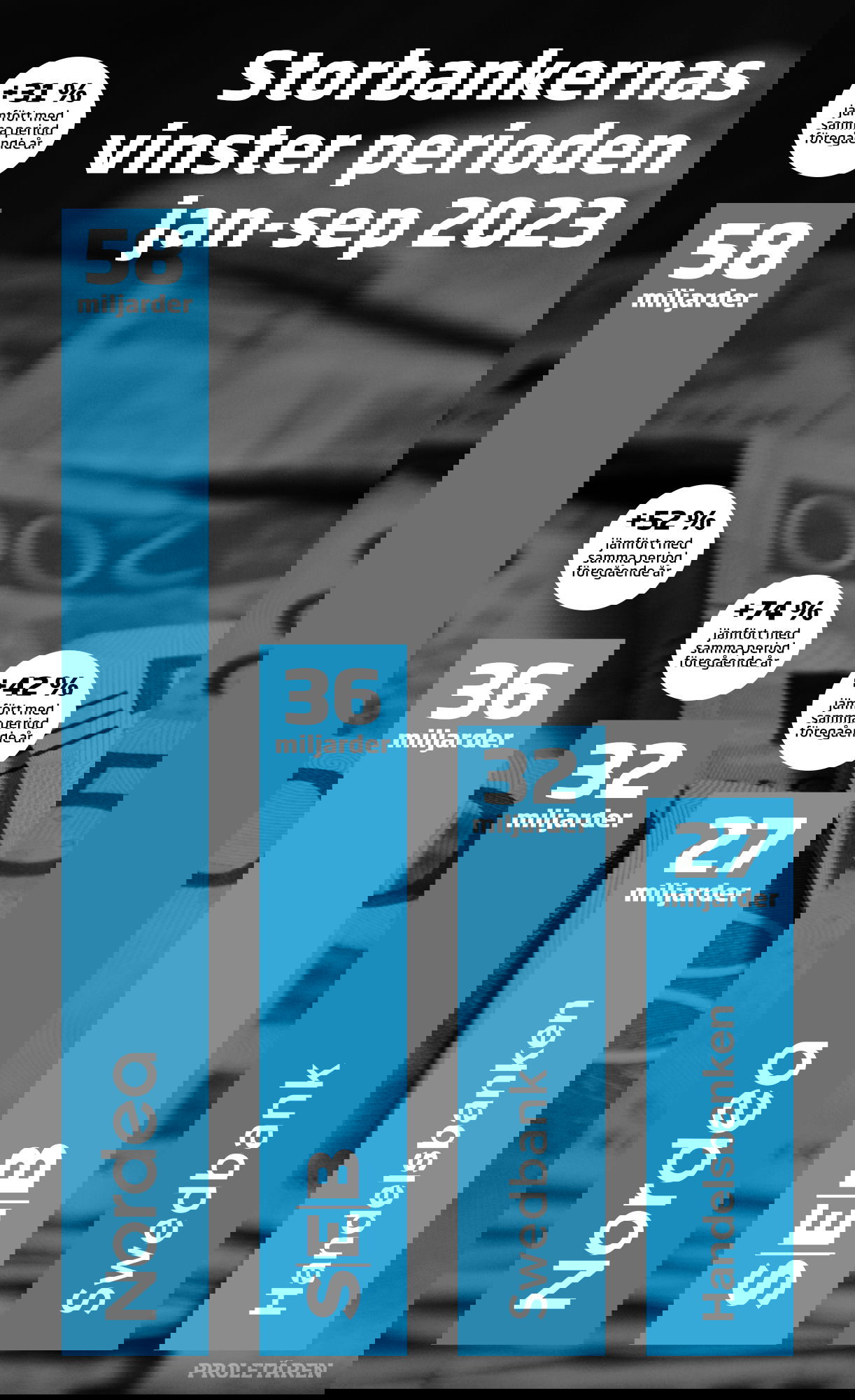 Mellan juli och september 2023 gjorde Sveriges fyra största banker sammanlagt 56 miljarder kronor i vinst. Som jämförelse beräknar Sveriges kommuner och regioner (SKR) att välfärden går med 28 miljarder kronor i underskott nästa år och vissa kommuner har redan infört vikariestopp på grund av det tuffa ekonomiska läget, något som Proletären skrev om i förra veckan.