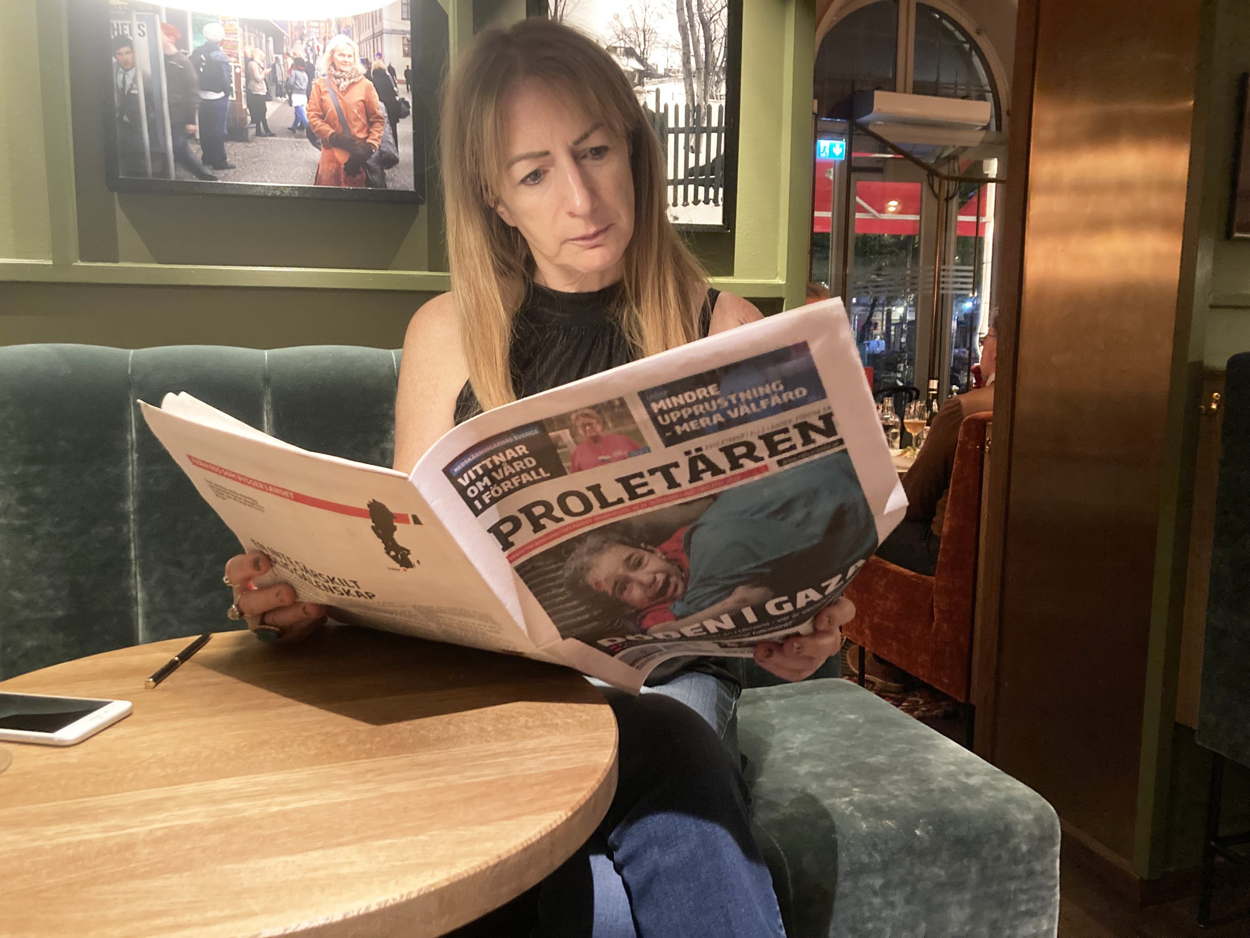 När vi efter avslutad intervju dyker in på ett falafelhak bjuds vi strax på bakelser och smårätter. Och en något förvånad Proletärenjournalist får ett gäng telefoner i handen för att ta bilder på personalen, som stolt poserar tillsammans med den irländska EU-parlamentarikern och tackar för hennes solidaritet med Palestina.