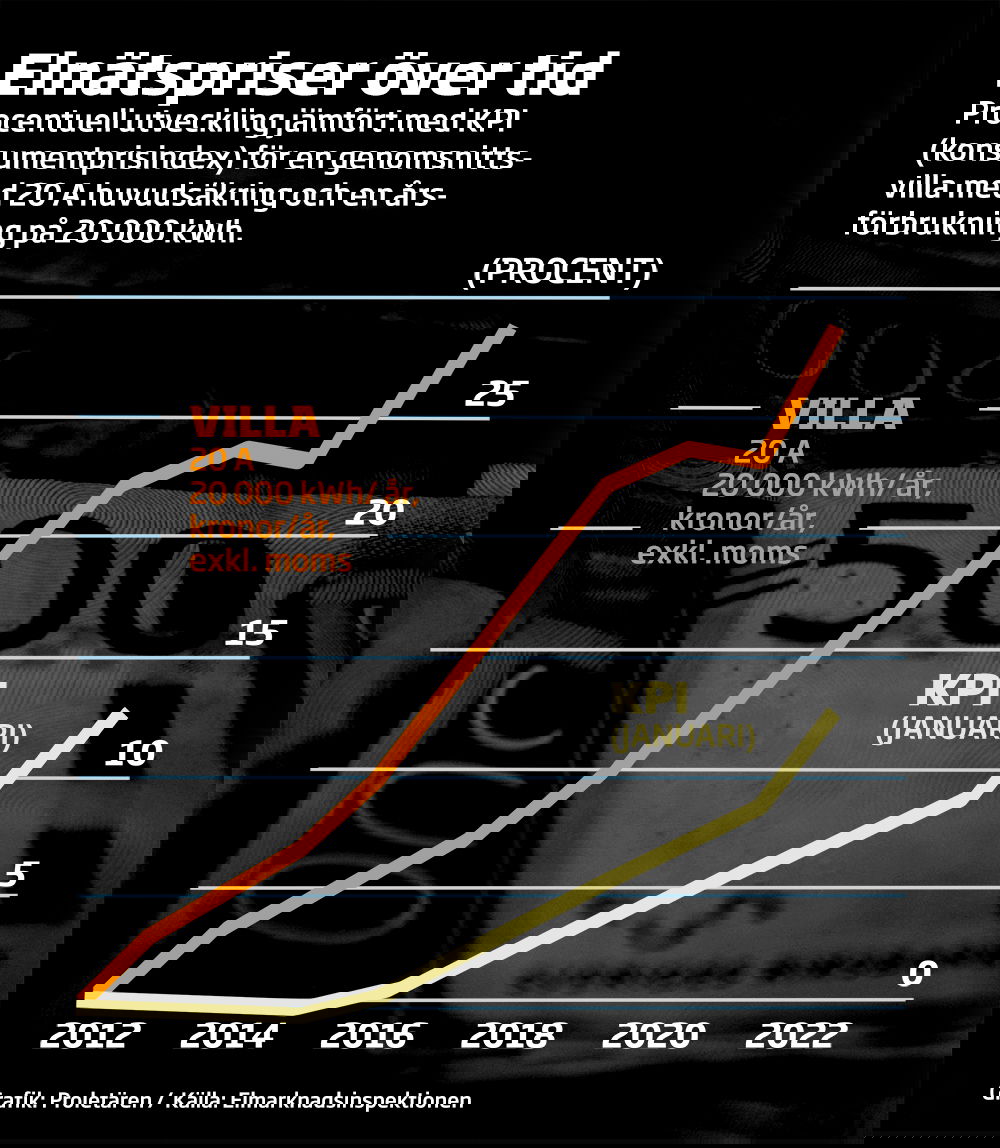 Enligt Dagens Nyheters granskning så har elnätspriset ökat med 28 procent under de senaste tio åren – mer än dubbelt så mycket som inflationen under samma period. Sveriges näst största elnätsföretag, Ellevio, höjde elnätspriset för lägenhetsinnehavare i Stockholm med 67 procent.