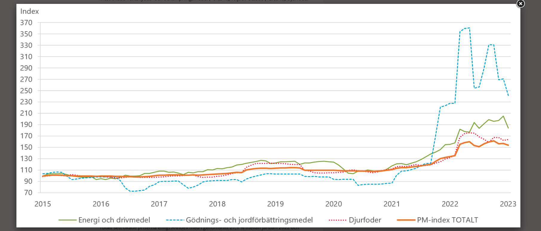 Under 2023 har priserna på konstgödsel fallit en bit bra bit från toppen, men de är fortfarande på höga nivåer jämfört med det historiska snittet. Utbudet av gödningsmedel ser ut att stabilisera sig inför nästa år, vilket bör leda till att priserna på livsmedel stabiliseras.