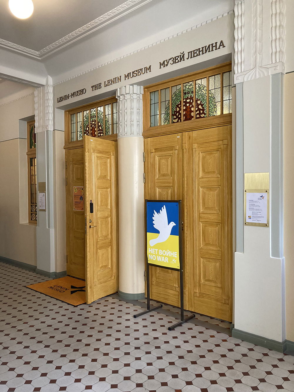 Det är veckan efter midsommar och 28 grader varmt i Tammerfors när jag, två finsktalande män och en liten grupp rysktalande turister letar oss en och en halv trappa upp till Leninmuseet i Folkets hus. Det första vi möts av är en skylt föreställande Ukrainas flagga med en vit duva och texten ”НЕТ ВОЙНЕ, NO WAR”.