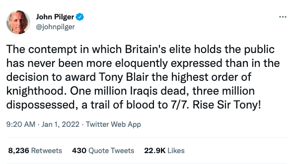 Den australiensiske journalisten John Pilger skriver sarkastiskt på Twitter att: ”Föraktet som Storbritanniens elit har för allmänheten har aldrig uttryckts mer välformulerat än i beslutet att förära Tony Blair den högsta riddarorden. En miljon irakier döda, tre miljoner fördrivna, ett spår av blod till (2005 års terrorattacker i London) 7/7. Res er Sir Tony!”
