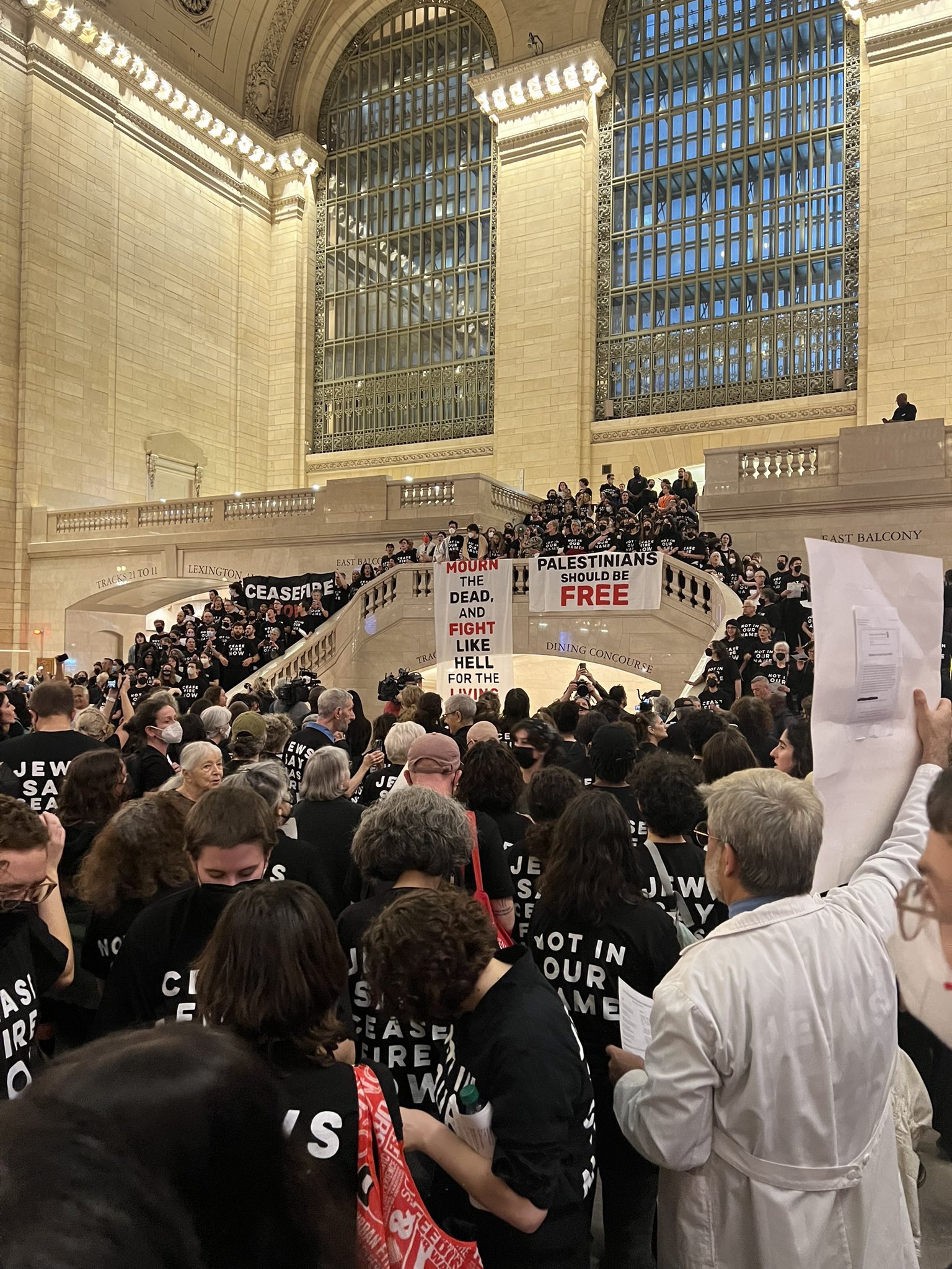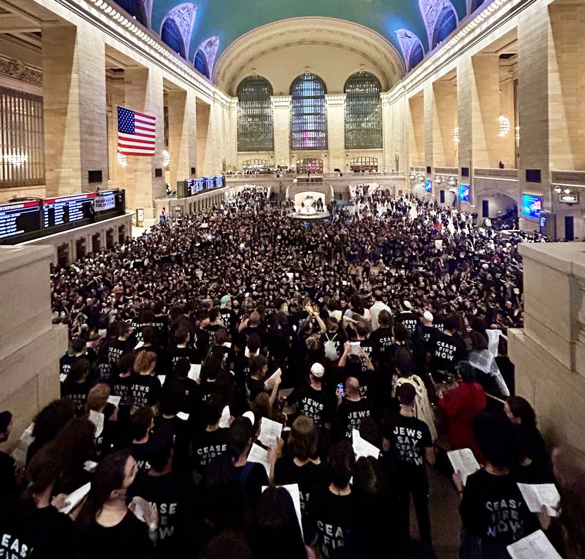 Samma krav som i London – Ceasefire Now! – hördes också från New York, där aktivister från Jewish Voice for Peace tog över centralstationen i vad organisationen beskriver som den största aktionen av civil olydnad sedan Irakkriget.