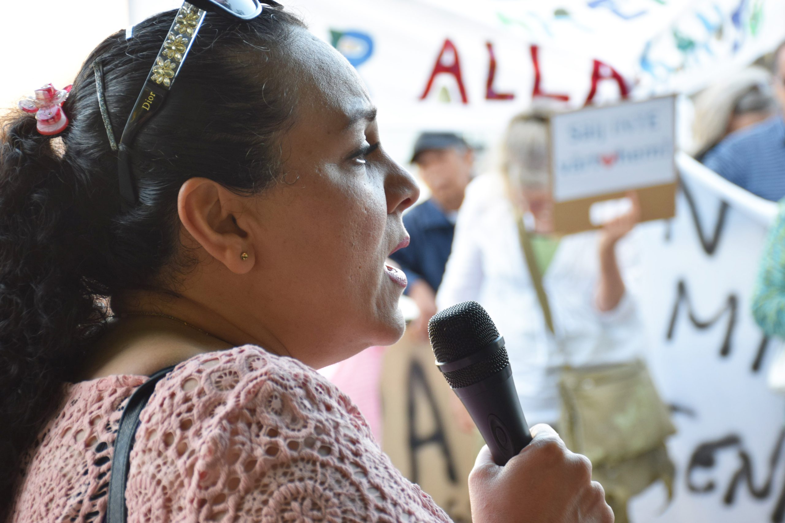 Mahasti Hashemieh talar på protest mot utförsäljningar av allmännyttans lägenheter på Marconigatan i Frölunda 2018. En strid som hyresgästerna vann. Foto: Artur Szandrowski