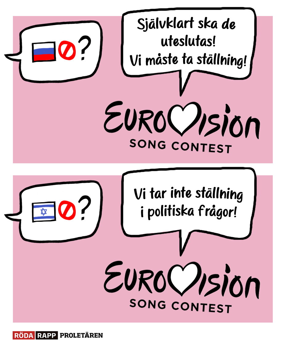 Visst, man kan man tycka att Eurovision och politik inte hör ihop… men är det inte lustigt att sådana röster bara höjs när det är tal om att utesluta Israel? När Belarus och Ryssland uteslöts hördes inga protester från dem som vill ”hålla musik och politik åtskiljda”. Tvärtom – 2022 gick till exempel Simmons ut med att alla artister i världen borde bojkotta Ryssland och jämförde dem som spelar där med artister som uppträdde i apartheidens Sydafrika… samtidigt som han själv står upp för en apartheidstat.