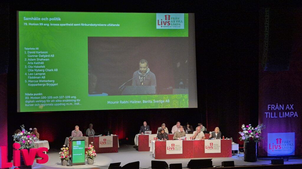 Mounir Rabhi Hallner var först upp i talarstolen och förklarade anledningarna bakom motionen. Utöver de fasansfulla bilder och videor som dagligen kommer från Gaza, men även från Västbanken menade han att Livs, som är ett fackförbund vars medlemmar arbetar med livsmedel och förser det svenska folket med mat, har en moralisk plikt att agera.