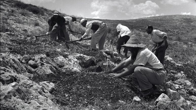 Israeliska kolonisatörer planterar träd i Gilboa-bergen, på den ockuperade Västbanken. Fotograf: Public Domain