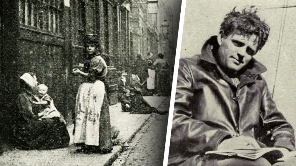 Jack Londons berömda reportagebok om fattigdomen i det brittiska imperiets huvudstad. Till höger: Jack London (1876-1916) Fotograf: Public Domain / Montage: Proletären