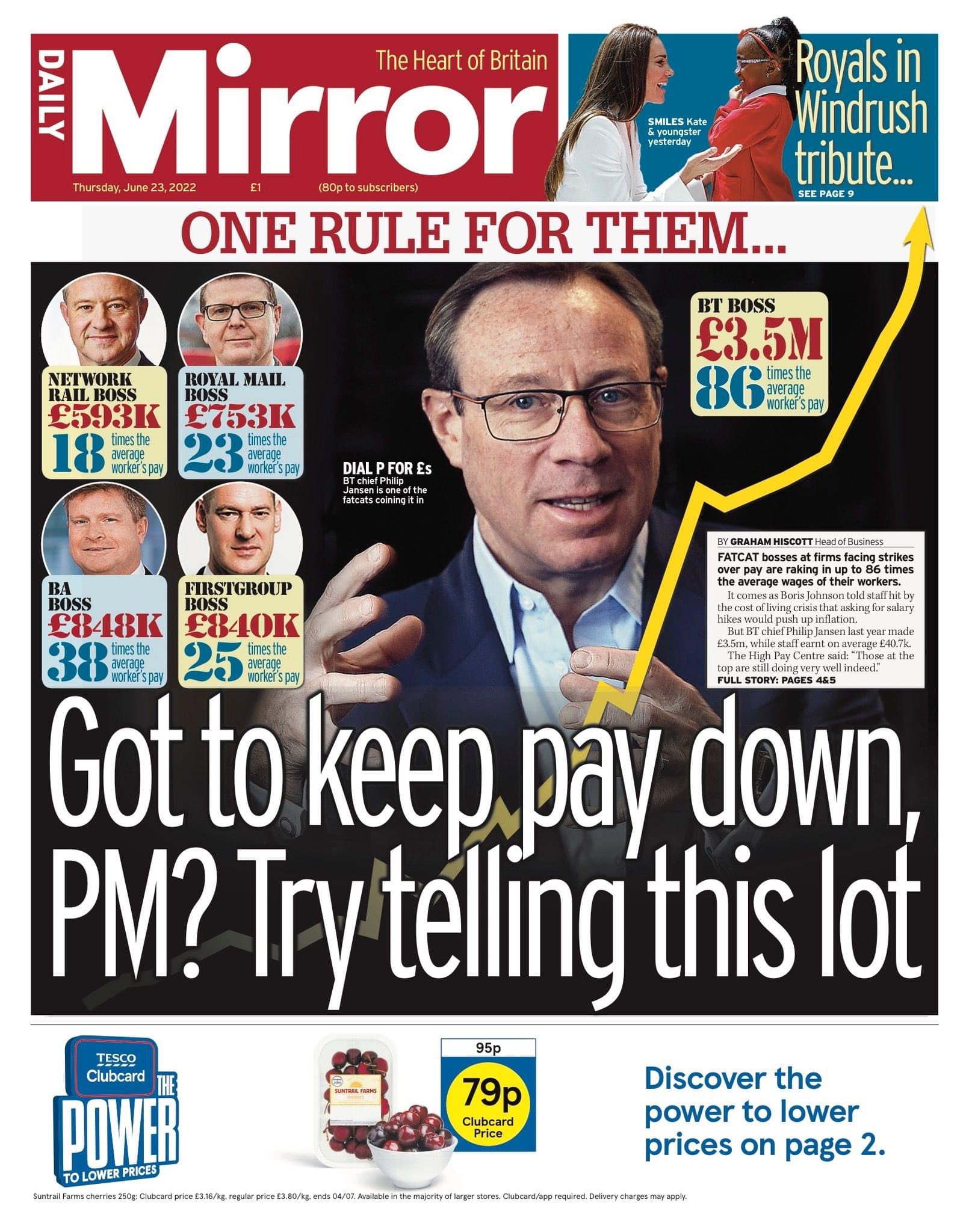 I dem har Lynch utmålats som både rabiat kommunist och facklig baron. Men i The Suns konkurrent, den Labourkopplade Daily Mirror (som också är full av kändisartiklar och rojalistiskt fjäsk), handlar dagens förstasida istället om löneskillnaderna mellan några av bolagstopparna och de som jobbar på tågen, på posten och på telekomjätten BT – där direktörerna tjänar 18 respektive 23 och 86 gånger så mycket som arbetarna.