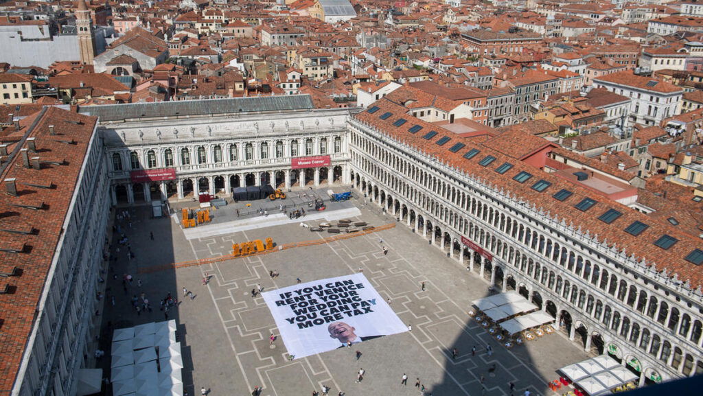 ”Om du har råd att hyra Venedig för ditt bröllop så har du råd att betala mer skatt” står det på den enorma protestbanderoll som Greenpeace vecklade på Piazza San Marco inför kapitalistbröllopet. Fotograf: Greenpeace / Michele Lapini