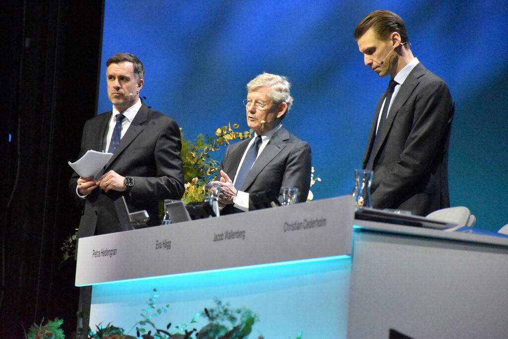 Klanen representerades av Jacob Wallenberg, son till Peter ”Pirre” Wallenberg och styrelseordförande i Investor. Om svensk industrikapitalism var ett tv-spel skulle han vara sista bossen. En riktigt slipad jävel. Det var fascinerade att lyssna på honom när han svarade på frågor från aktieägarna. Inte minst klimatorganisationen som köpt en enskild aktie för att komma in på stämman och ställa honom mot väggen. Han tuggade i sig dem som skumtomtar.