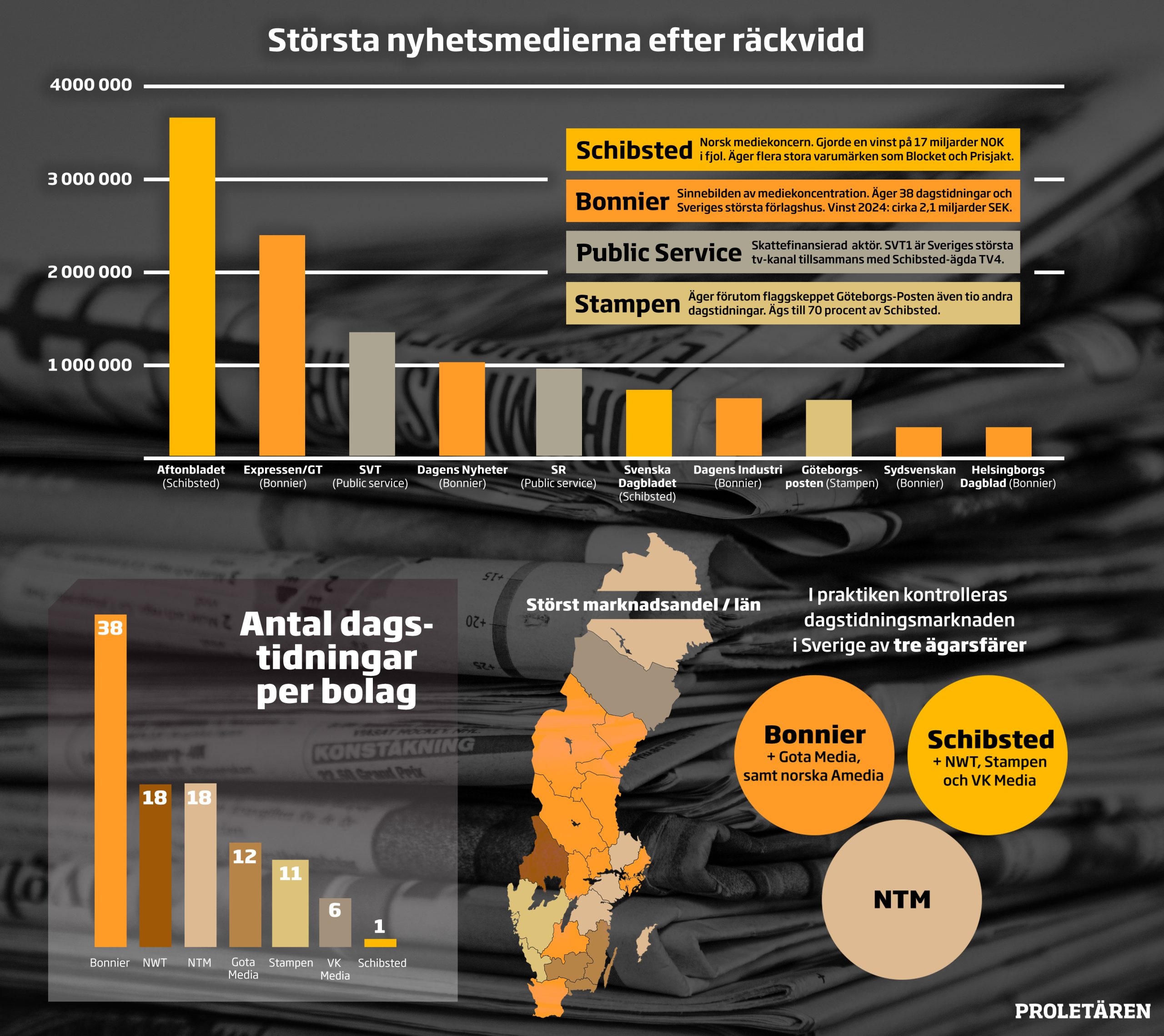 Allt som allt kontrollerar Bonnier/Gota Media 52 procent av alla dagstidningsprenumerationer i landet. NTM kontrollerar 25 procent. Schibsted/Stampen/NWT/VK-Media kontrollerar 21 procent.
