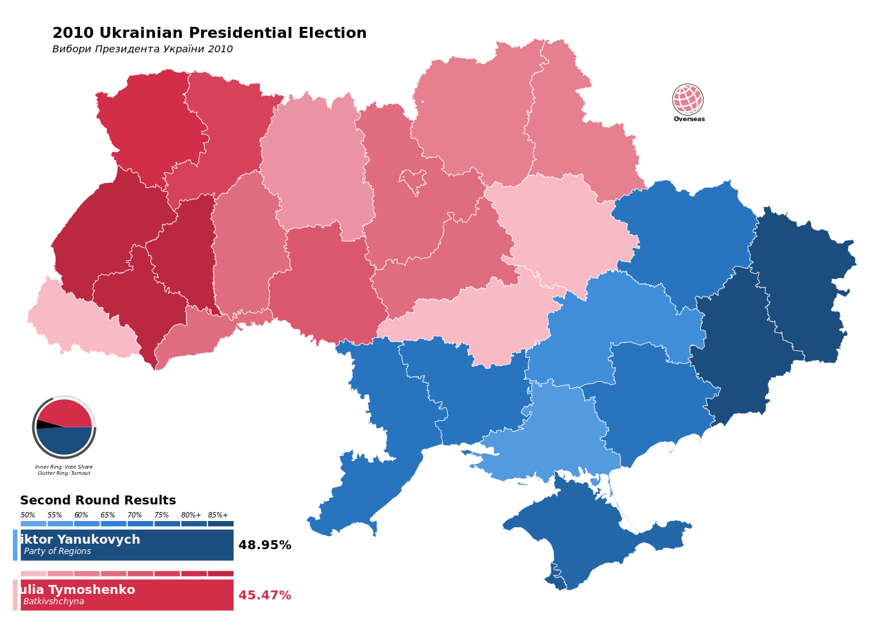 Yanukovytj fick sin revansch 2010, då han vann presidentvalet tack vare ett överväldigande stöd i östra och södra Ukraina (se karta). I detta val fick Nato-förespråkaren Jusjtjenko endast 5,45 procent av rösterna. Valet bedömdes som rättvist av såväl ukrainska som västliga observatörer, så Janukovytj installerades utan prut.