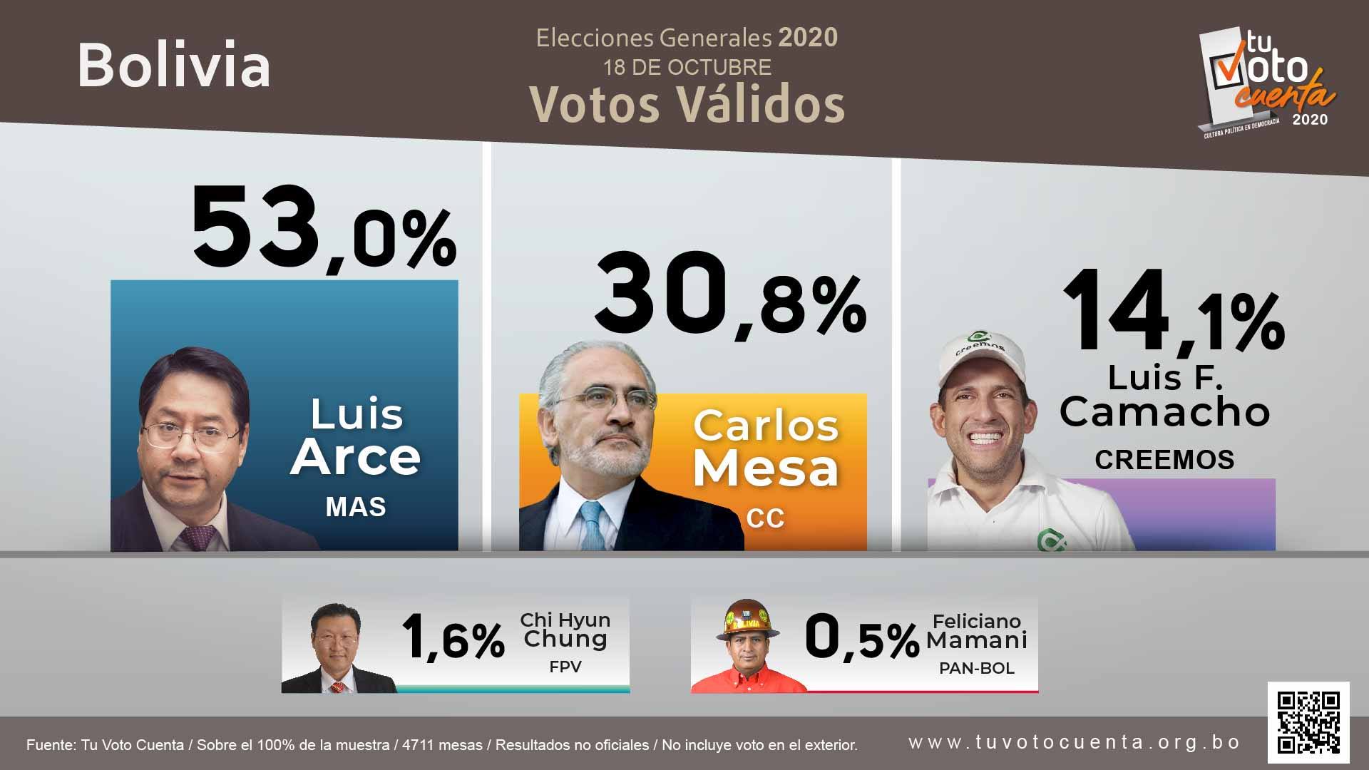Mas kandidat Luis Arce blir president redan efter första valomgången, visar vallokalsundersökningarna. Med 53 procent av rösterna, över 20 procentenheter mer än högerkandidaten Carlos Mesa, ser det socialistiska Maspartiet också ut att få egen majoritet i både övre och undre kammaren i parlamentet.