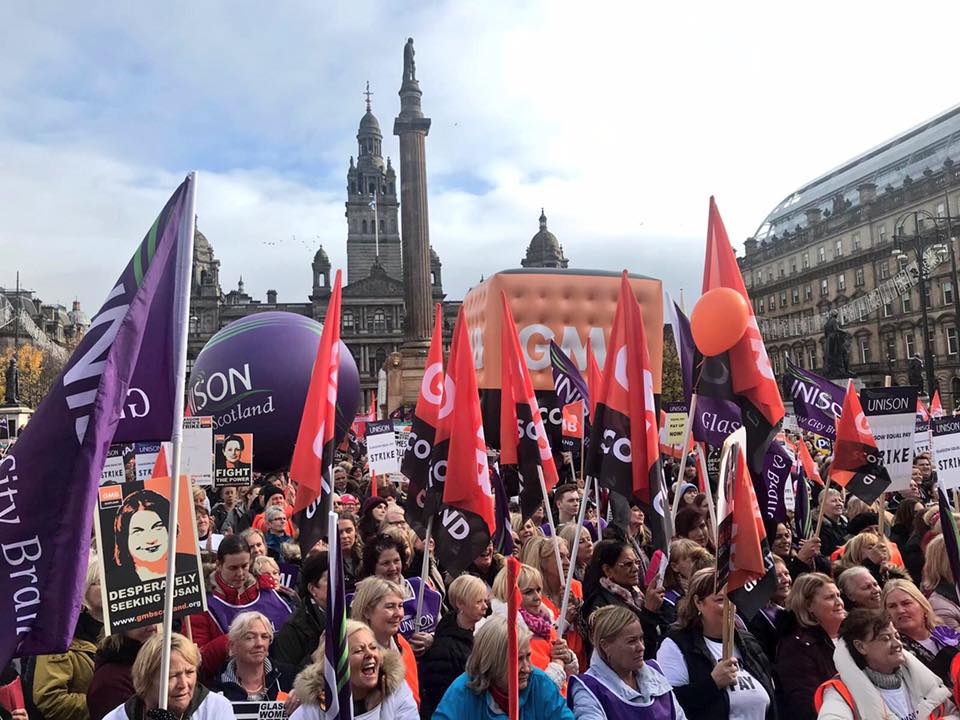 Tusentals kvinnor demonstrerade utanför rådshuset i Glasgow och möttes av politiker som lovade att kvinnliga arbetare skulle kompenseras för utebliven lön, ett rättsligt krav som drivits av kvinnor i Glasgow i tio år. Samtidigt rapporterar brittiska Evening Times att manliga renhållningsarbetare vid nio renhållningsstationer i staden lagt ner arbetet i spontana stödaktioner till förmån för de strejkande kvinnorna.