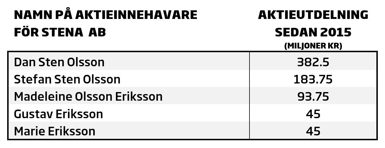 Framgångarna har genererat stora intäkter till moderbolaget Stena AB som sedan 2015 gjort en vinst på mer än 8,2 miljarder kronor (summan för 2019 är ännu inte fastställd). Vinsten har dock inte bara gått tillbaka in i företaget. Enligt årsrapporterna har bolagets ägare, familjen Olsson-Eriksson, plockat ut mer än 750 miljoner kronor i aktieutdelningar.