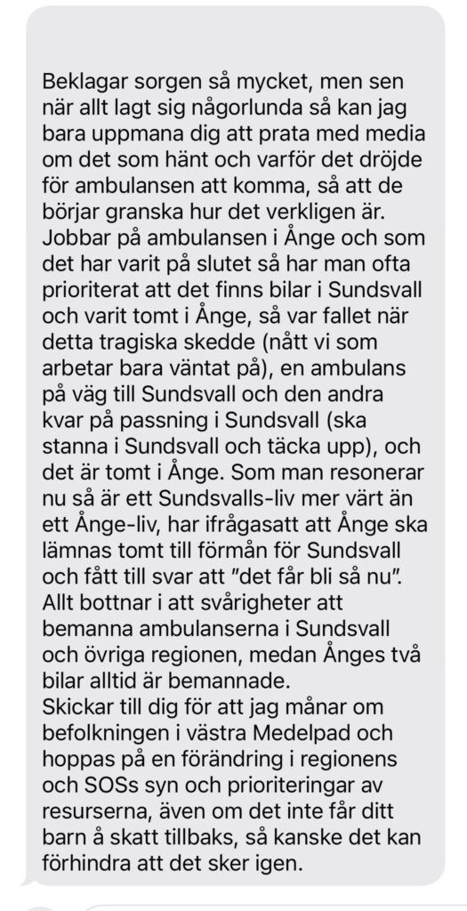 I stället för svar på sina frågor från ansvarigt håll har Camilla Claesson fått ett SMS från en anonym anställd på ambulansen i Ånge. Hen skriver att ”när det tragiska skedde (nåt vi som arbetar bara väntat på), var en ambulans på väg till Sundsvall och den andra kvar på passning i Sundsvall och det är tomt i Ånge”.
