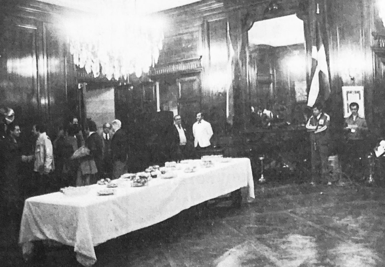 I drygt en halvtimme fick vi vänta innan general Merlo var klar med den svenska delegationen och sina taskspelarkonster. Jag såg mig omkring i rummet. Det var ganska stort och högt i tak. Framför mig hängde en jättestor spegel med den svenska och den argentinska flaggan prydligt på varsin sida. I spegeln kunde jag se de stora gnistrande kristallkronorna i taket liksom det väldukade bordet mitt på golvet.