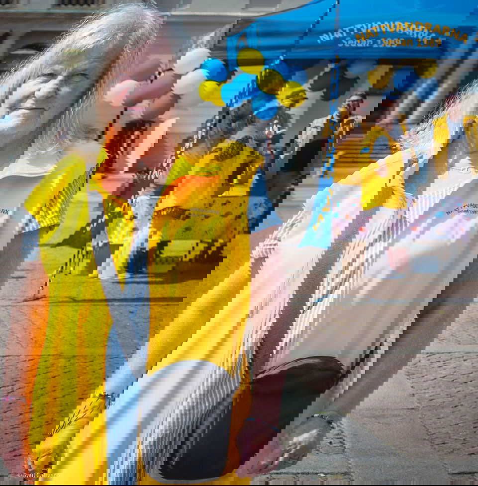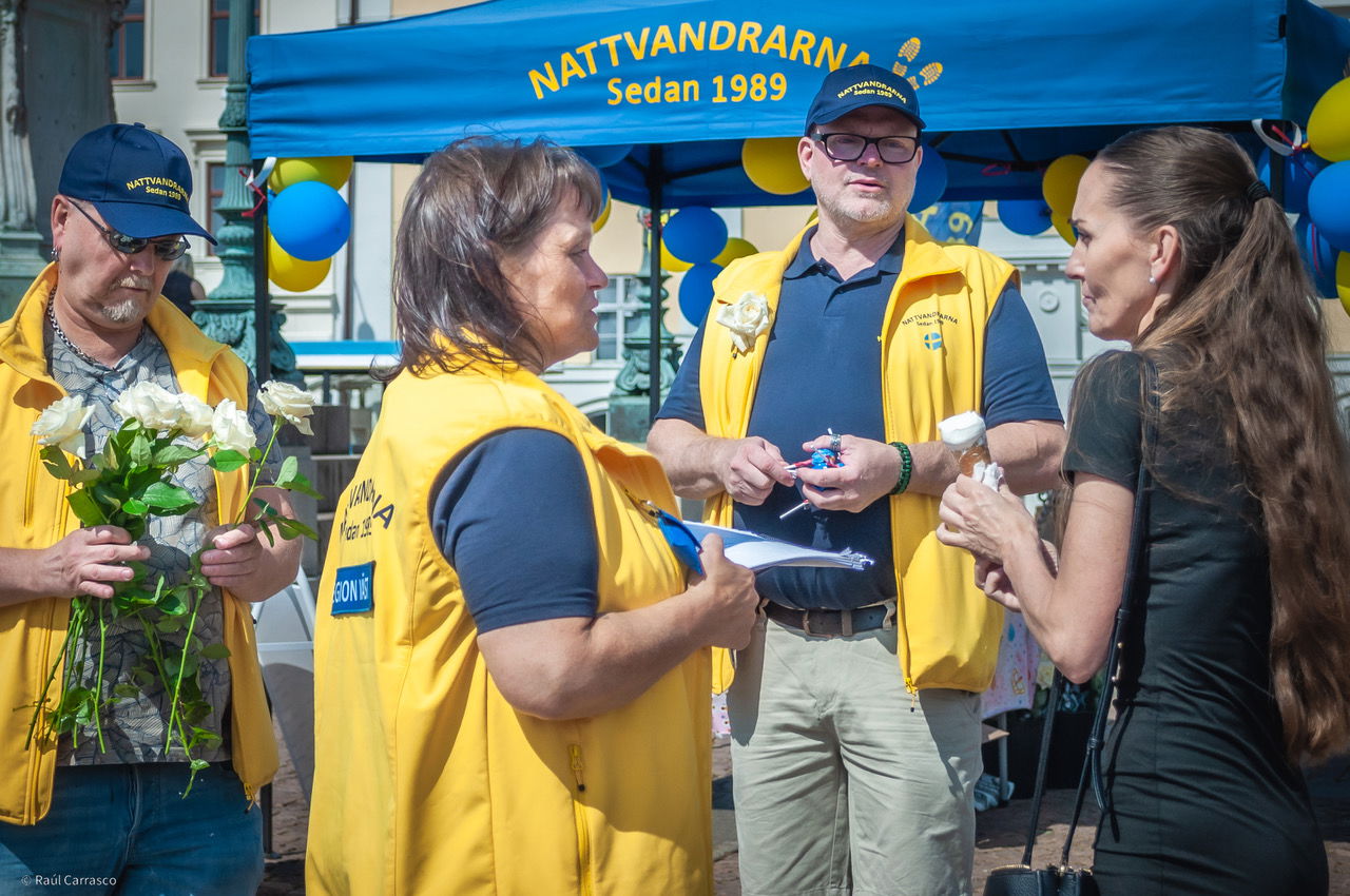 På torget träffar vi nattvandrarna Marita Karlsson och Yvonne Sana, som delar ut blommor till förbipasserande. De berättar att bemötandet är bra, och att många vill prata om våldet och skjutningarna.