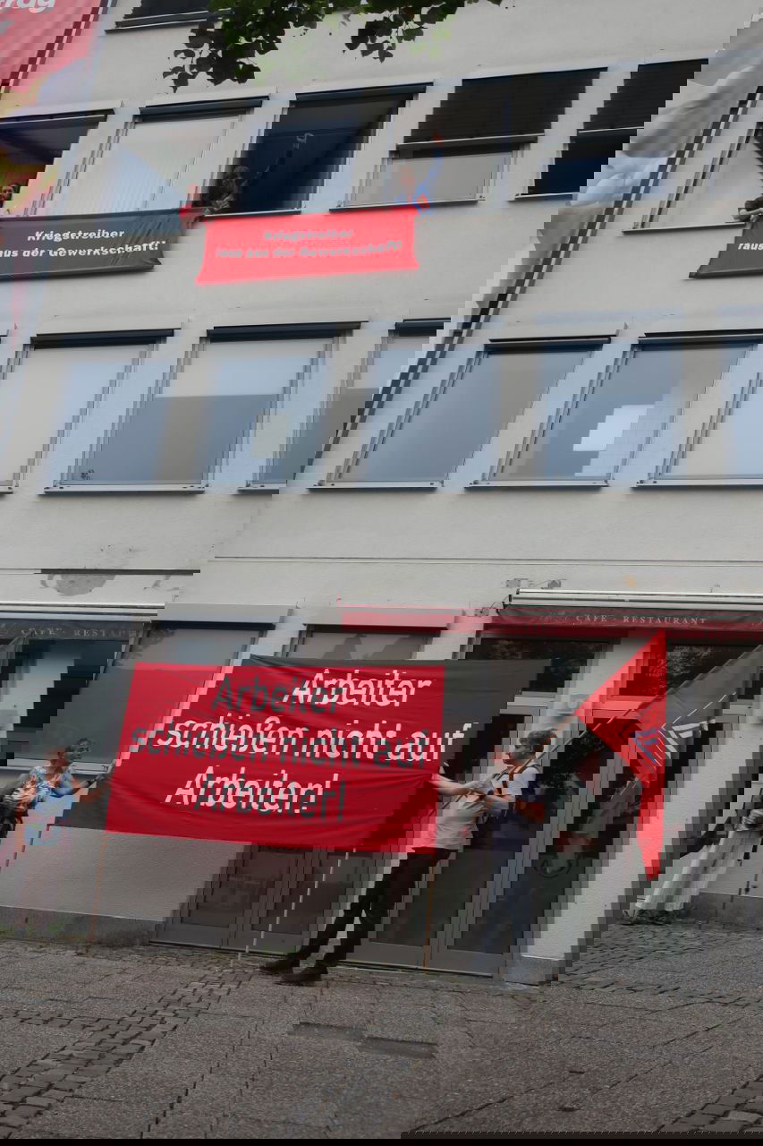 I Ingolstadt i södra Tyskland ockuperade antikrigsaktivister IG Metalls kontor i stadens fackföreningshus under några timmar förra tisdagen. Innan de blev bortförda av polis hann de hänga en banderoll med texten ”Krigsivrare – ut ur facket!” från fönstret. Nedanför hölls en banderoll upp med texten ”Arbetare skjuter inte på arbetare”.