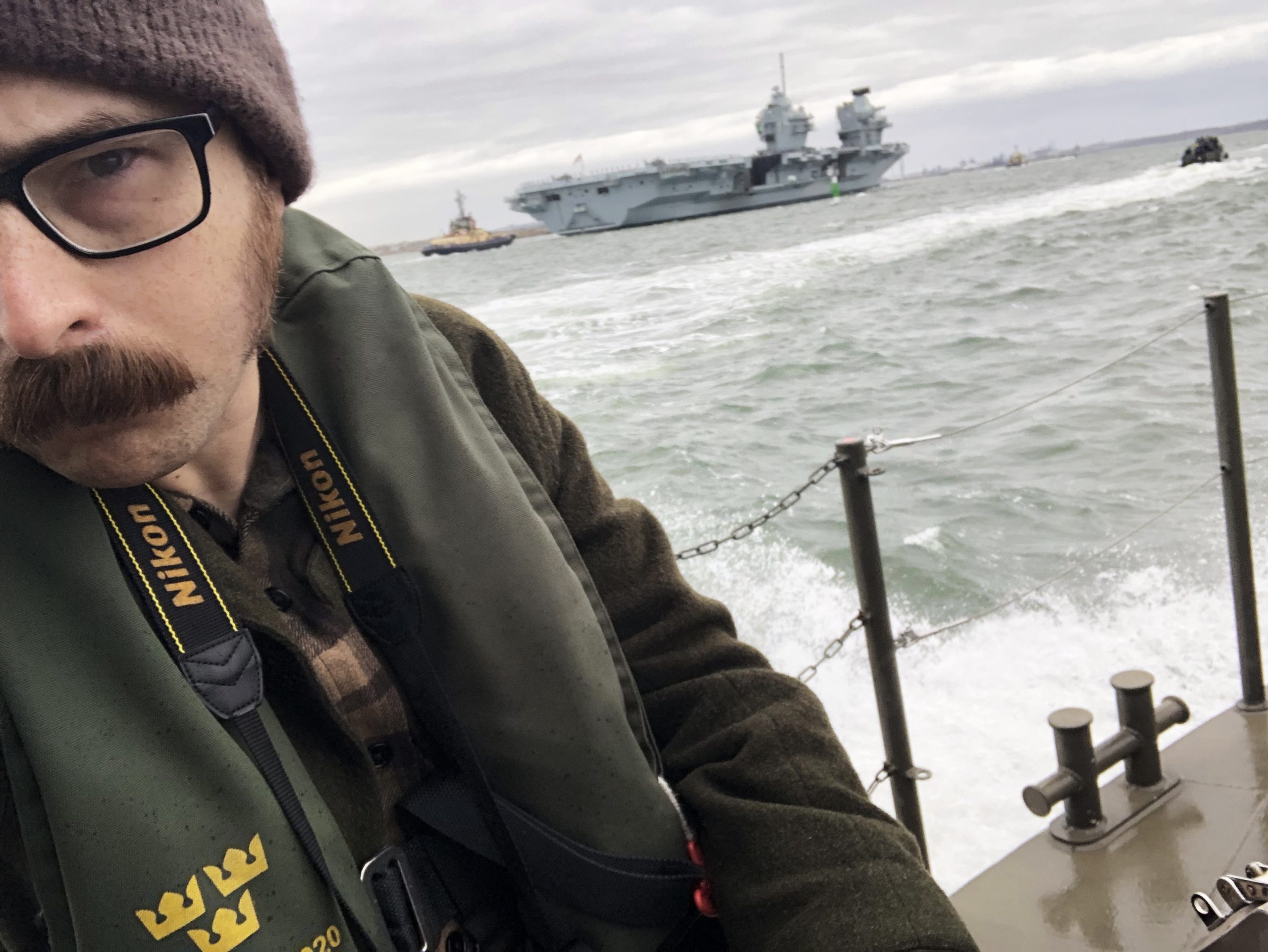 Jag och några andra journalister har nappat på inbjudan från Älvsborgs amfibieregemente att följa med på en bevakningsbåt och plåta ankomsten. Kanske ställa några inställsamma frågor, bländade av skeppets storhet.