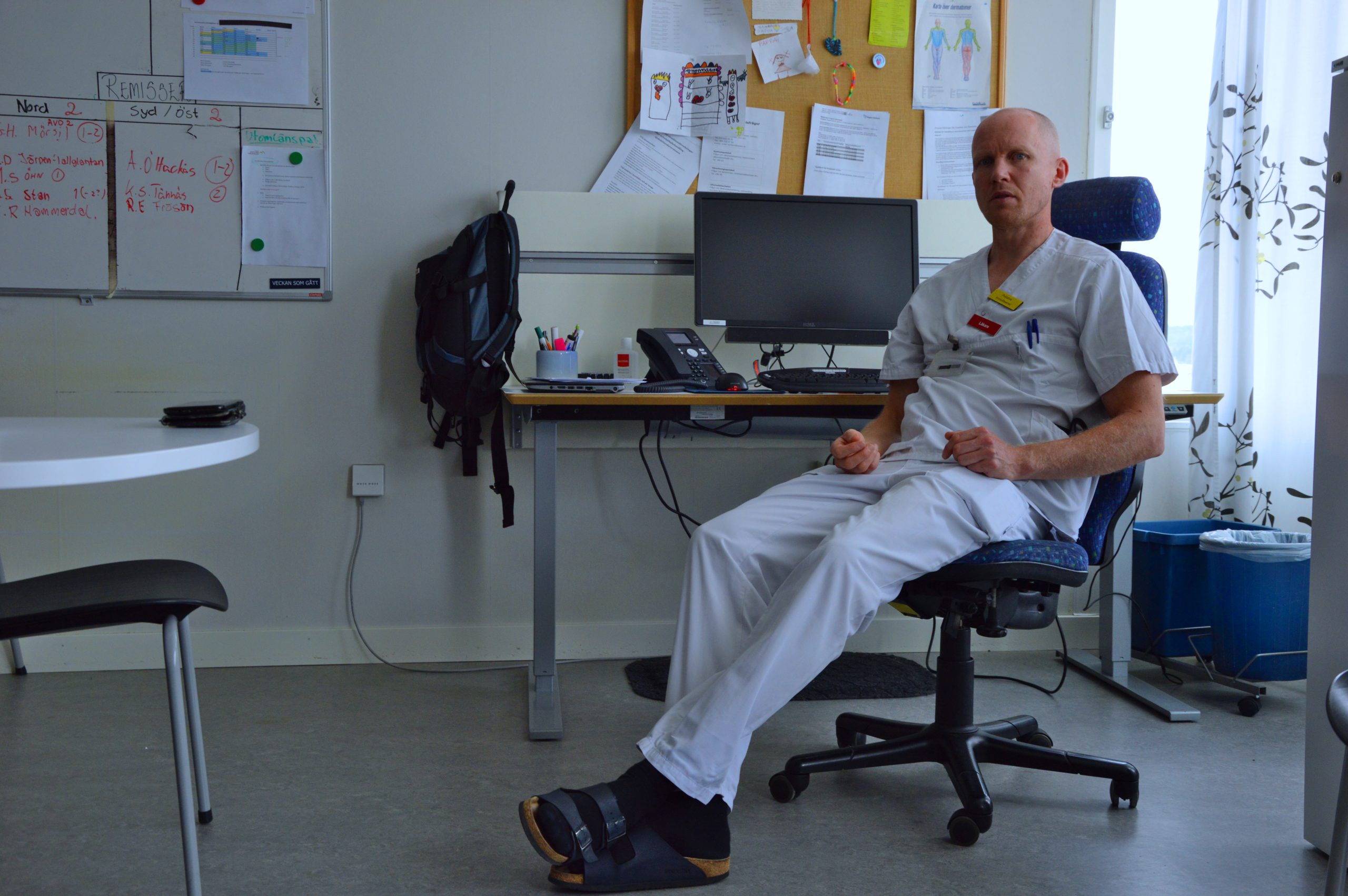 Oskar Knutsson är läkare på den palliativa enheten tre våningar upp. Sedan en tid tillbaka är han engagerad i protesterna som riktat sig mot ledningen och politikerna inom Region Jämtland/Härjedalen.