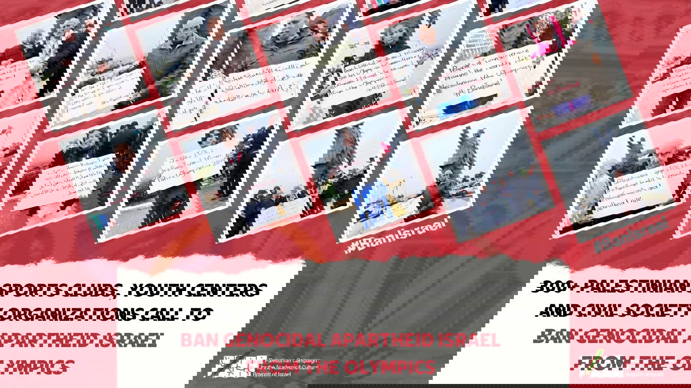 Nu går också runt 300 palestinska klubbar, fotbollsklubbar för både män och kvinnor, samt basket- och volleybollag ut och kräver att Israel idrottsbojkottas, detta i de döda palestinska idrottsmännens- och kvinnornas namn. I uppropet till IOC, #BanIsrael, heter det att IOC måste ”tillämpa sina principer och uppfylla sina skyldigheter genom att förbjuda Israel från att delta i nästa olympiska spel, i Paris i juli 2024. Detta tills Israel upphör med sina allvarliga brott mot internationell rätt, särskilt det israeliska apartheid-systemet och det pågående folkmordet i Gaza”.