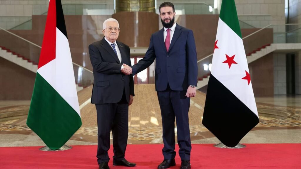 Syriens de facto-ledare Ahmed al-Sharaa (till höger) tillsammans med Palestinska myndighetens president Mahmoud Abbas. Fotograf: X/Laith Arafeh
