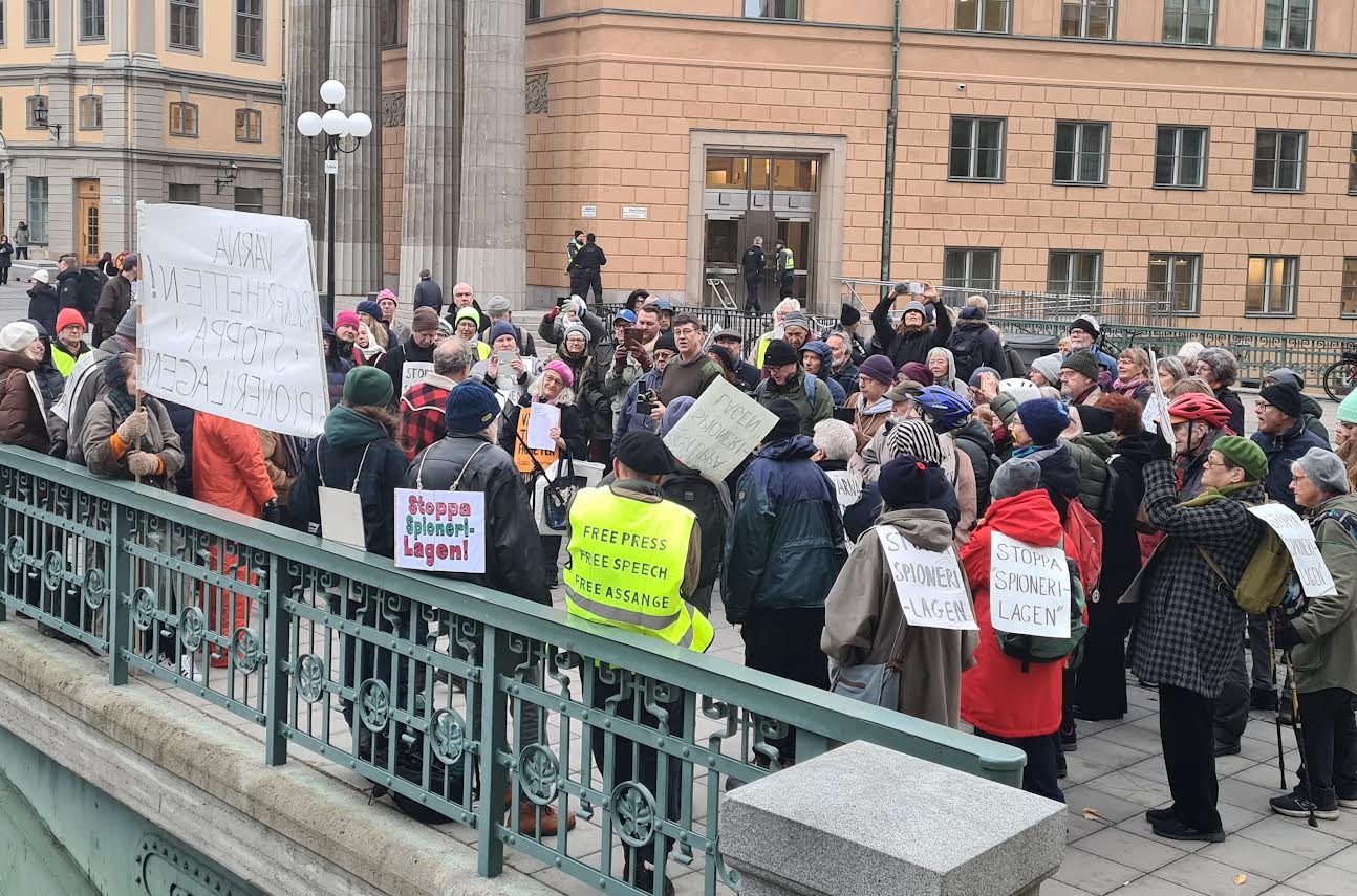 Medan riksdagsledamöterna från alla partier utom V och MP på onsdagen röstade för den nya spionerilag som gör det straffbart för visselblåsare och journalister att avslöja uppgifter som ”kan skada Sveriges förhållande till någon annan stat eller en mellanfolklig organisation”, samlades med kort varsel ett hundratal personer på Mynttorget utanför riksdagshuset för att protestera mot lagen.