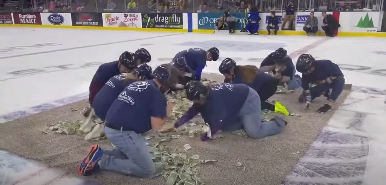 Lärare som inför en vrålande publik kämpar mot varandra om att samla upp så många dollarsedlar som möjligt, för att kunna…