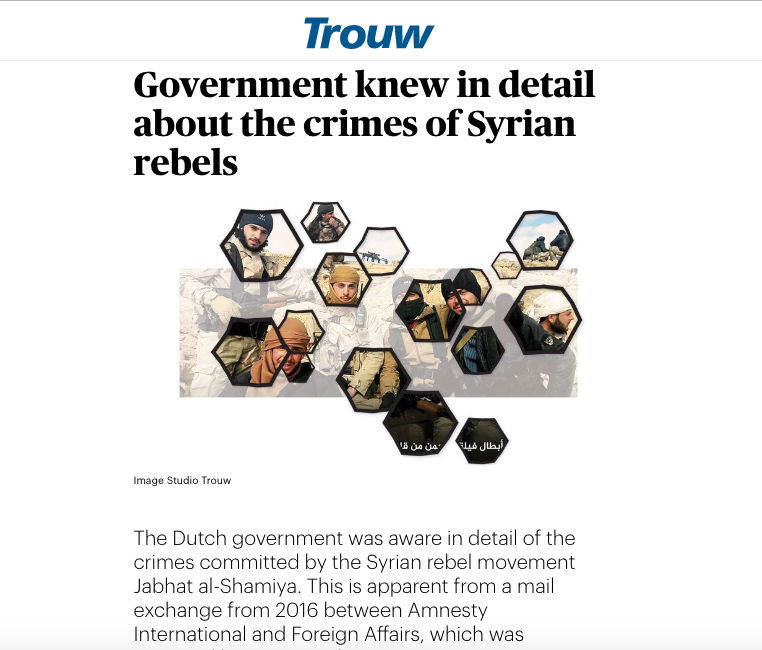 Dels hade Amnesty två år tidigare presenterat en rapport för den nederländska regeringens Syriensändebud med uppgifter om att Jabhat al-Shamiya utfört summariska avrättningar och begått andra grova människorättsbrott i Aleppo- och Idlibprovinserna. Dels pågick vid tiden för avslöjandet en rättegång i Nederländerna mot en man som varit med i Jabhat al-Shamiya. I åtalet fastslogs att organisationen är ”salafistisk och jihadistisk”, ”strävar efter att upprätta ett kalifat” och därför måste klassificeras som en ”kriminell terroristorganisation”.