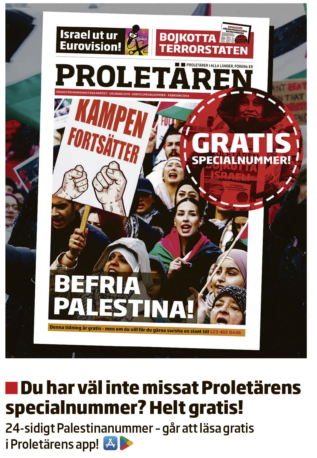 – Palestina är i blickfånget för hela världen. En världsomfattande solidaritet med det utsatta palestinska folket växer. I Sverige är vi många som är en del av denna rörelse. En känsla som faktisk inte funnits på det sättet på många år. Det finns hopp. Det som händer i Sverige och i världen idag förenar många av världens folk. Men vi måste mobilisera ännu fler krafter och pressa Israel, USA och den svenska regeringen allt mer. Då kan vi inom en inte alltför avlägsen framtid se ett fritt Palestina.