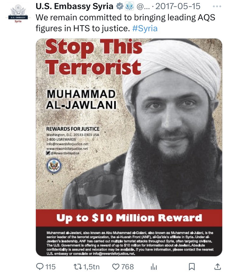 Det var ju Jolani som både skapade och ledde terrorgruppen Jabhat al-Nusra, som idag går under namnet HTS och som även den är terrorstämplad av bland annat USA.